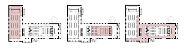 In the second building, originally intended to house a cinema hall for party rallies, it was essential to establish a direct connection between the newly designed event hall and the public square. To achieve this, one of the few interventions on the original shell of the Cooperative House was made by opening up a portion of the existing external wall.