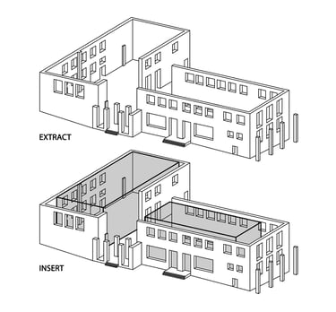 One of the main challenges of the building lies in its sheer mass and sacle, versus the compact village houses. By simply clearing the current structure while maintaining its outer framework, we preserve a tangible reminder of an era market by distinct social norms. We insert two minimal wooden structures, each possessing its own unique wooden framework. This not only creates a striking contrast with the massive shell but also contributes to its structural stability.