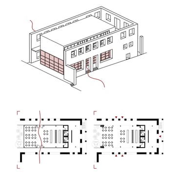 The connection between the interior and exterior is minimal, with the heavy stone walls drawing a clear and rigid boundary between the two. To counter this sense of enclosure, the building should be opened up, reducing its imposing mass while introducing a greater sense of fluidity and openness.